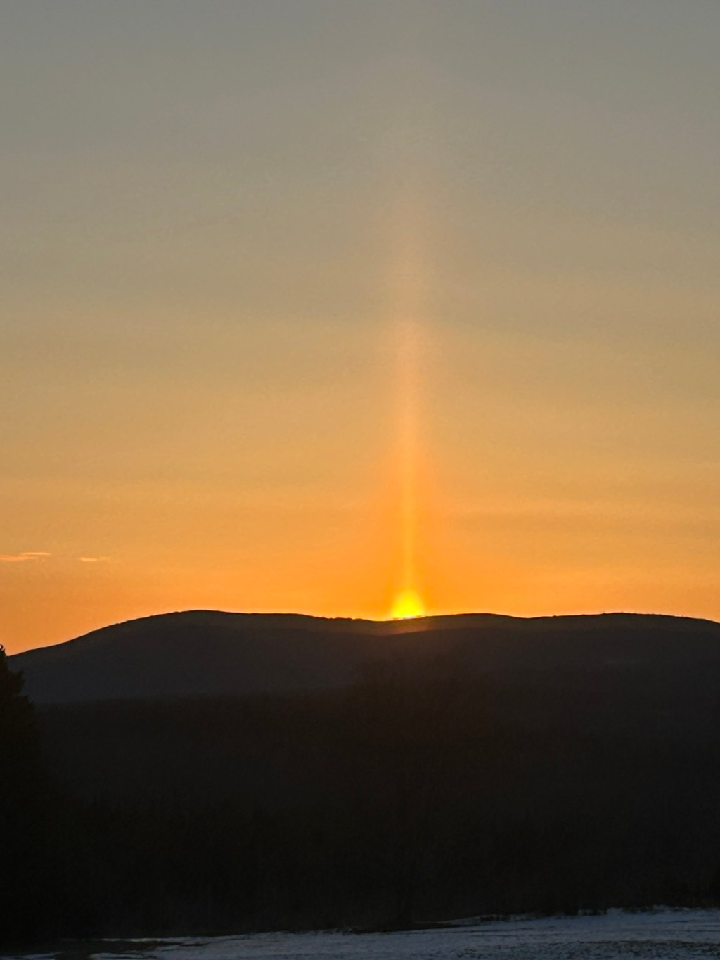 Mornings start with PK deciding it is time for me to rise — she begins to cry, then walks over me until I surrender. Even though it was bitterly cold last night, snow still on the ground, I keep the bedroom curtains open so I can see the stars at night and the sunrise in the morning. This is what I woke to: a sun pillar. Ice crystals aligning with the rising sun — or, in a spiritual context, a touch point of the Holy. In Jewish, Christian, Indigenous, Muslim, and Hindu faiths, it is a sacred sign.